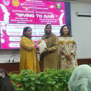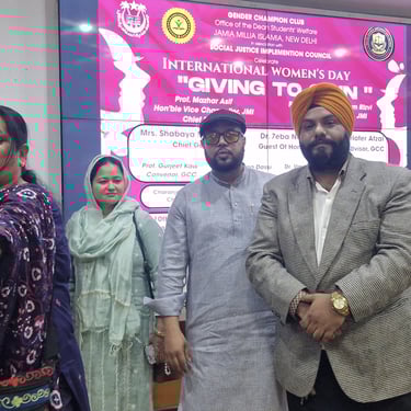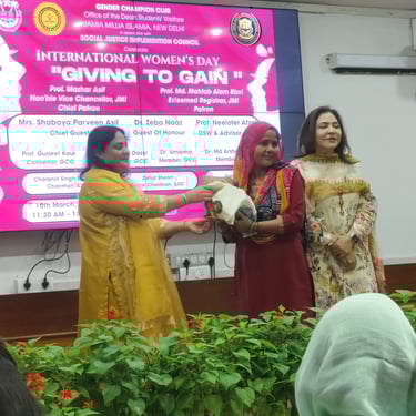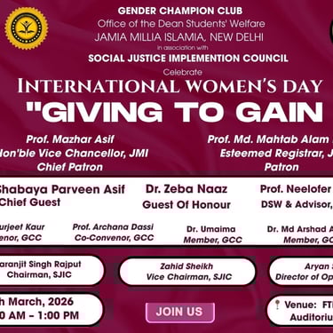 The Social Justice & Empowerment Implementation Council (SJIC) organized a Women’s Day seminar titled “Giving to Gain” and a community camp at Jamia Millia Islamia University, promoting women’s empowerment, awareness, and social engagement.